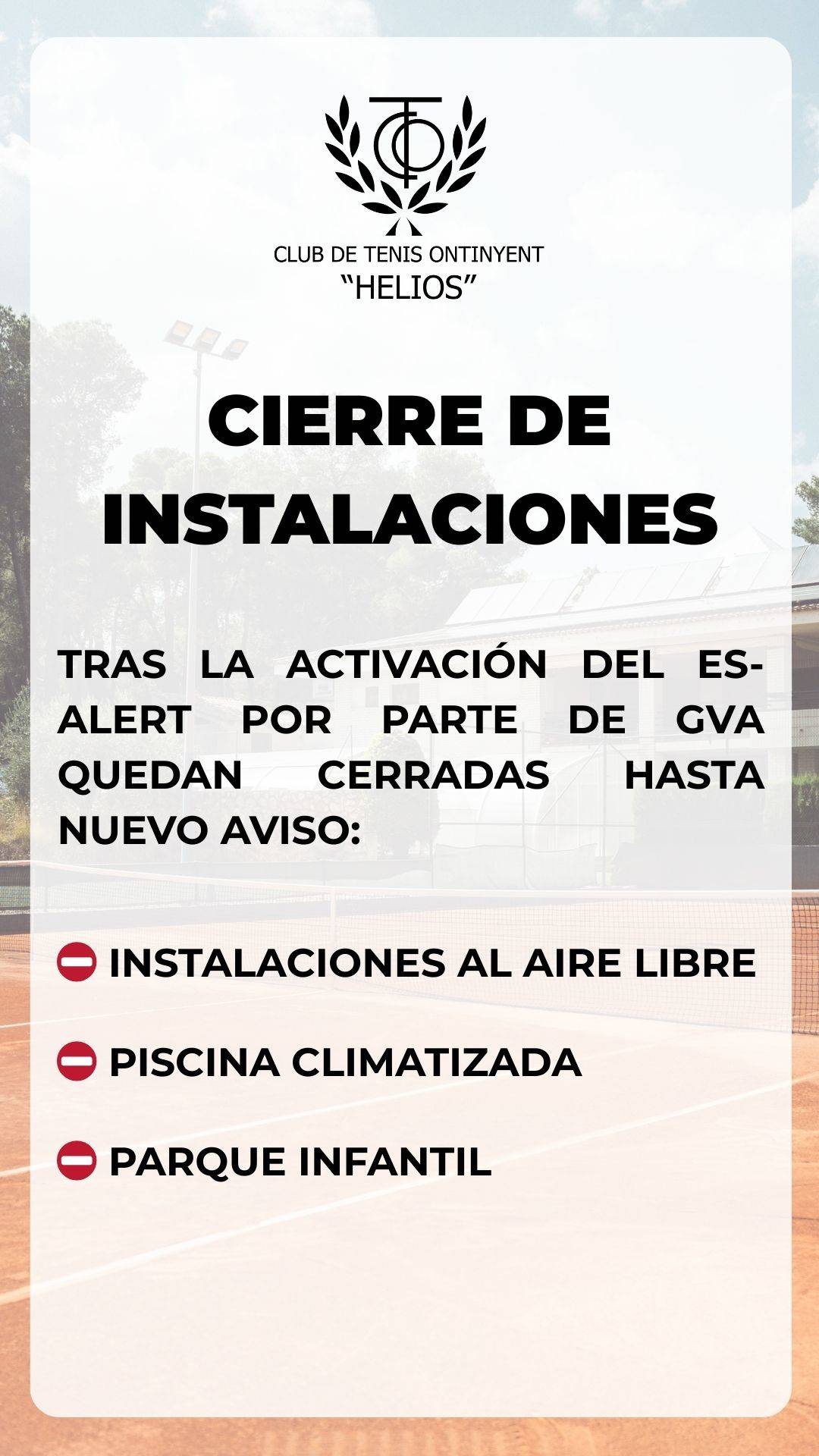 Ante la activación del sistema ES-Alert por parte de Generalitat Valenciana, en el que se recomienda expresamente “evitar circular por parques y zonas arboladas, desplazamientos innecesarios y actividades en el exterior”, y atendiendo a criterios de seguridad y prevención, el Club procede al cierre de todas las instalaciones al aire libre, así como de la piscina y el parque infantil, hasta nuevo aviso.